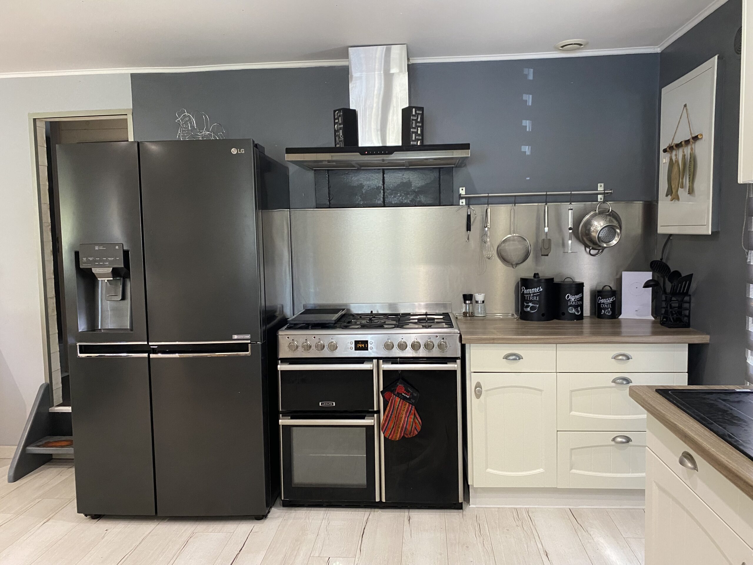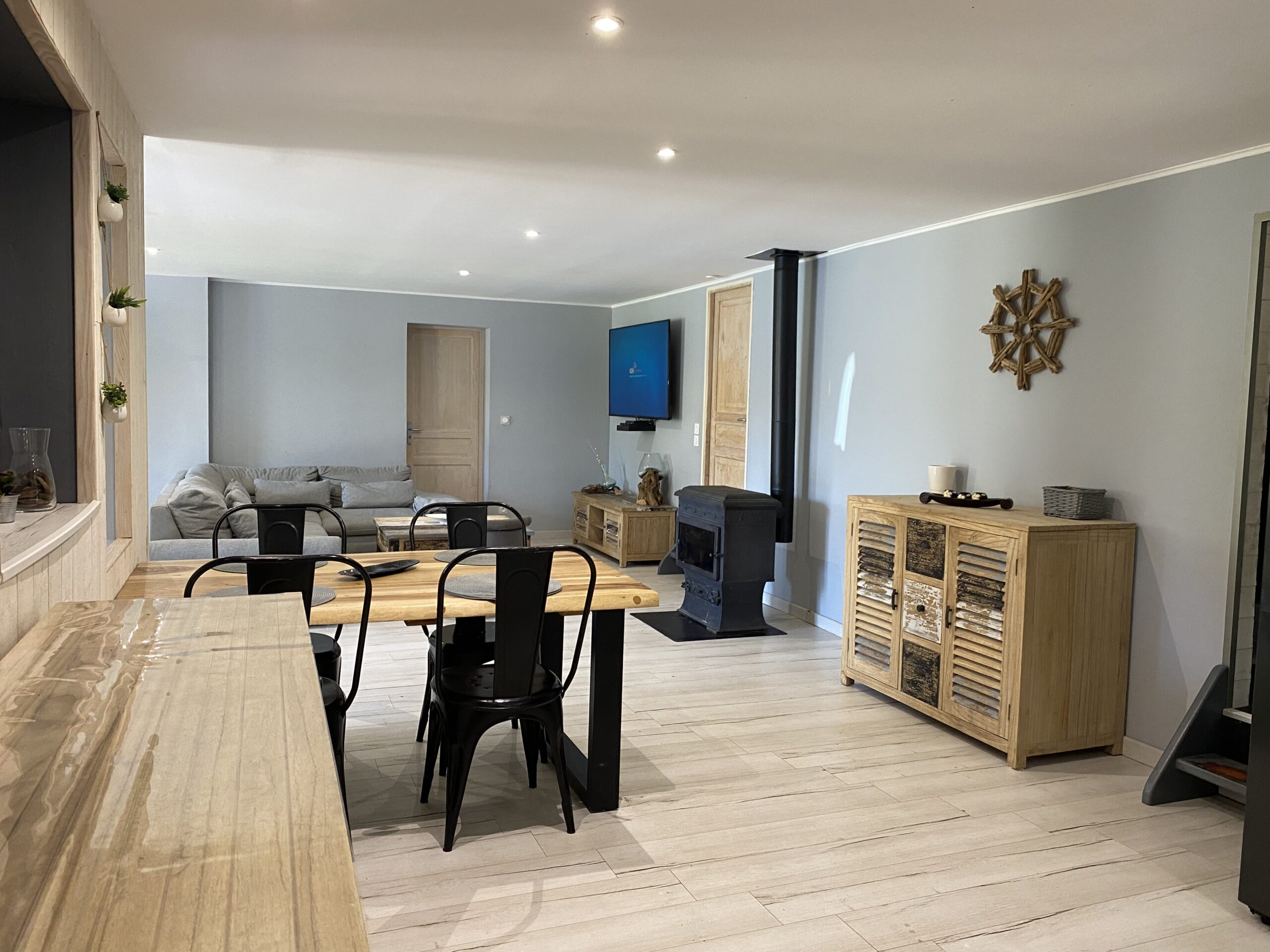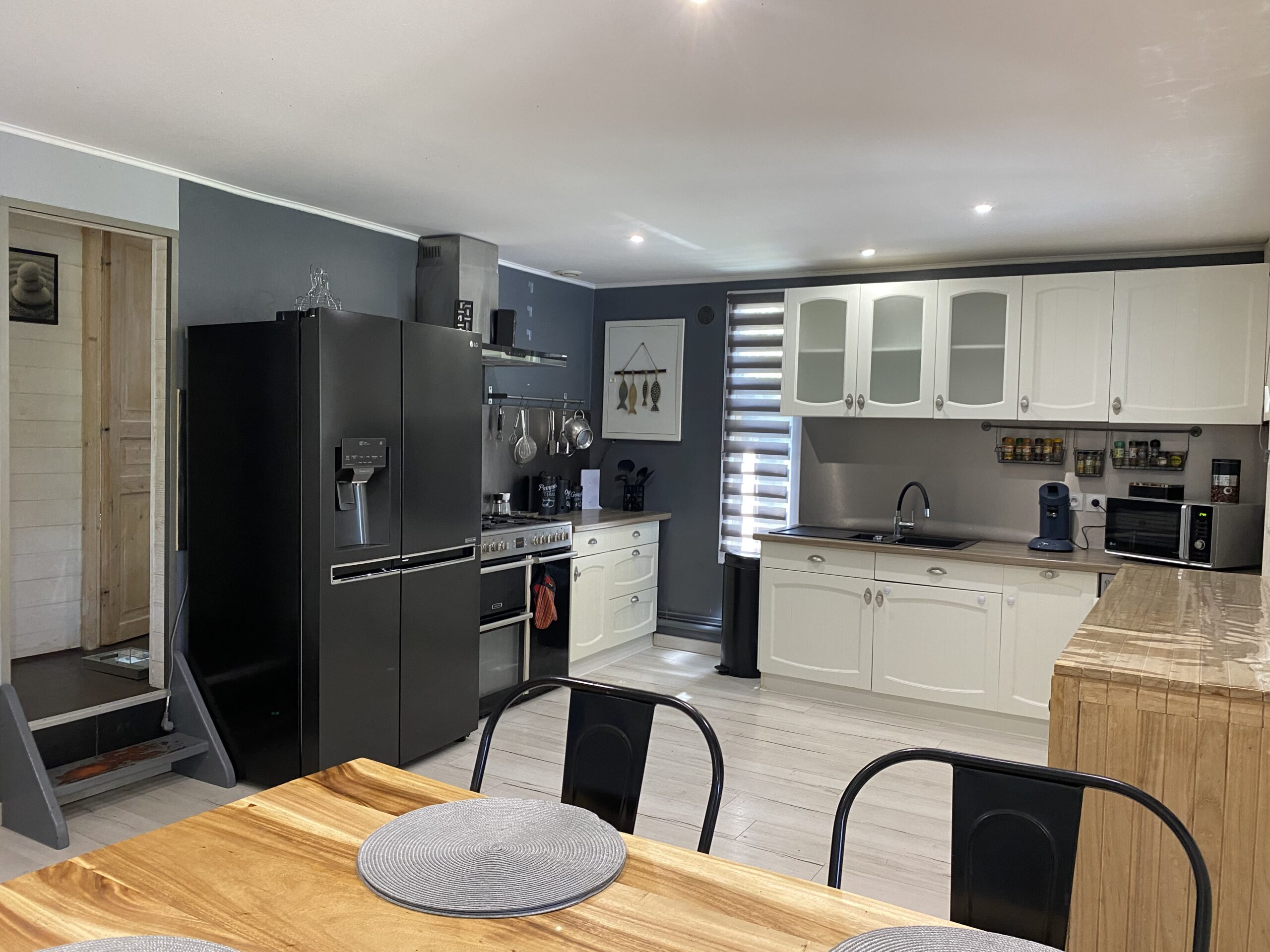– Une spacieuse pièce de vie comprenant une cuisine entièrement équipée ouverte sur le salon et la salle à manger.